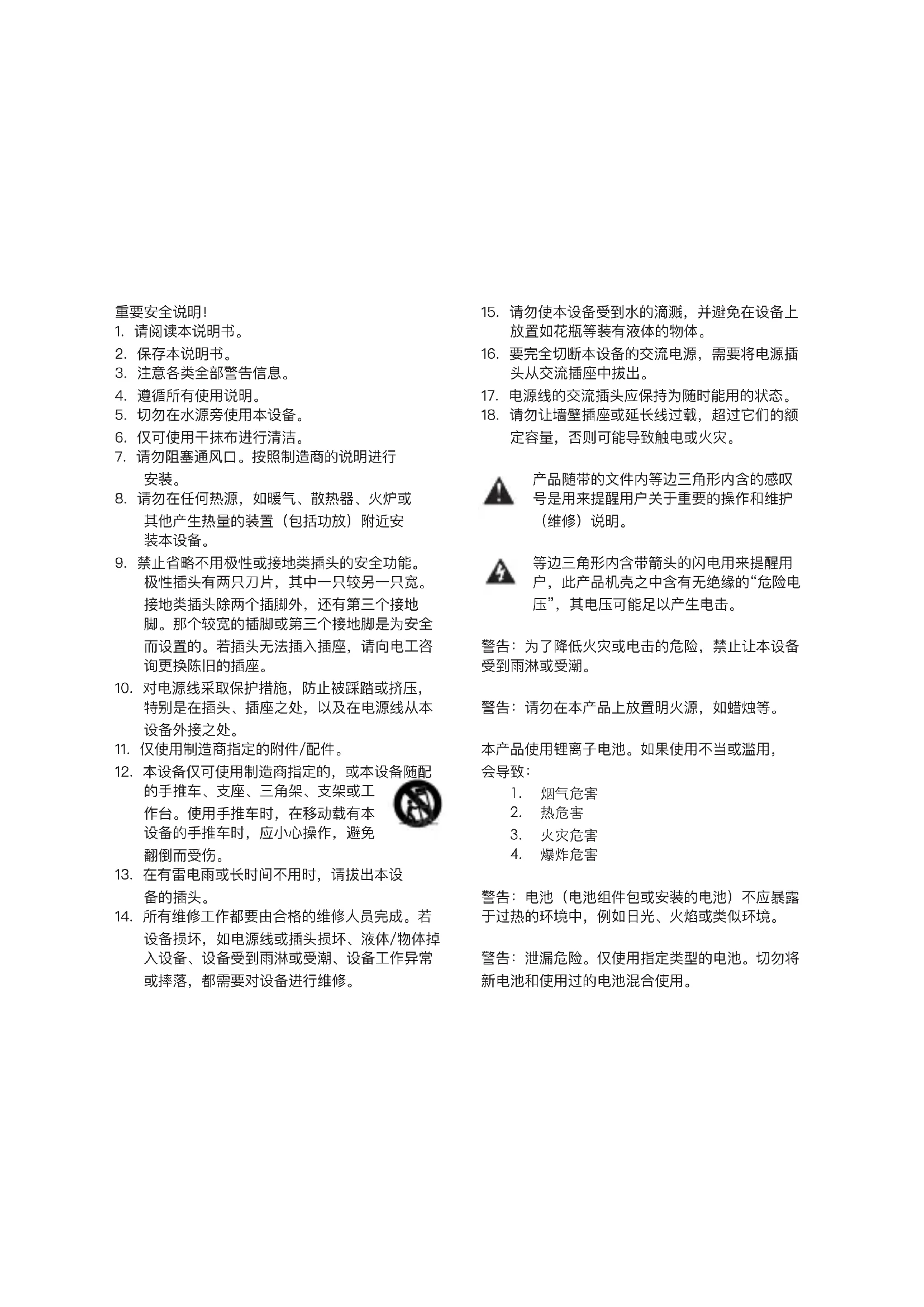 為這可能會導致觸電或火災。 等邊三角形內的感嘆號旨在提醒用戶產品隨附的文 獻中存在重要的操作和維護(維修)說明。 等邊三角形內帶有箭頭符號的閃電旨在提醒 用戶產品外殼記憶體在未絕緣的“危險電壓” ,其強度可能足以對人體構成電擊風險。 警告:為降低火災或電擊風險,請勿將本設 備暴露在雨中或潮濕的環境中。 警告:產品上不應放置明火源(如蠟燭) 本產品使用鋰離子電池。 如果誤用或濫用,可能會導致:
