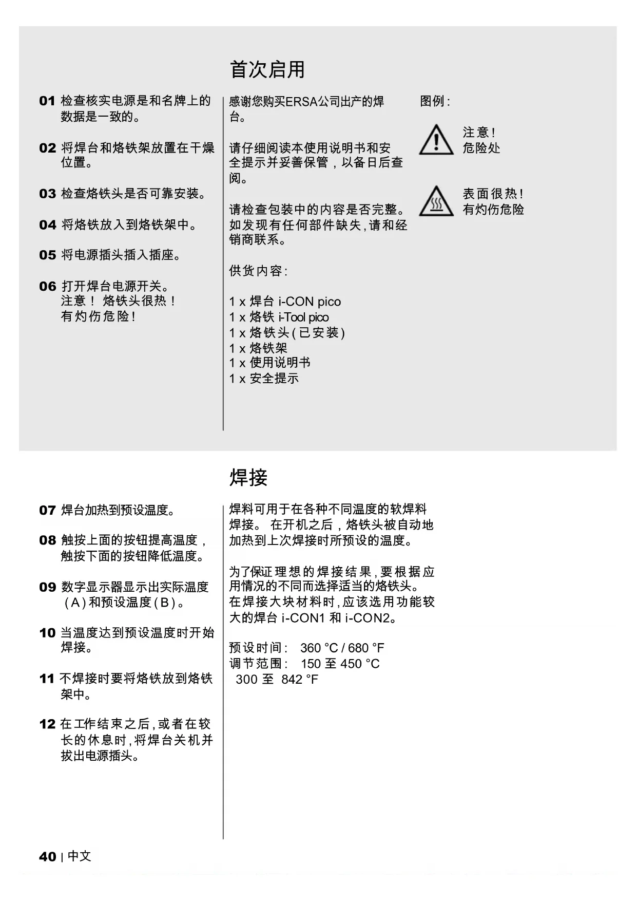 1 x 焊台 i-CON pico 1 x 烙铁 i-Tool pico 1 x 烙 铁 头(已 安 装) 1 x 烙铁架 1 x 使用说明书 1 x 安全提示