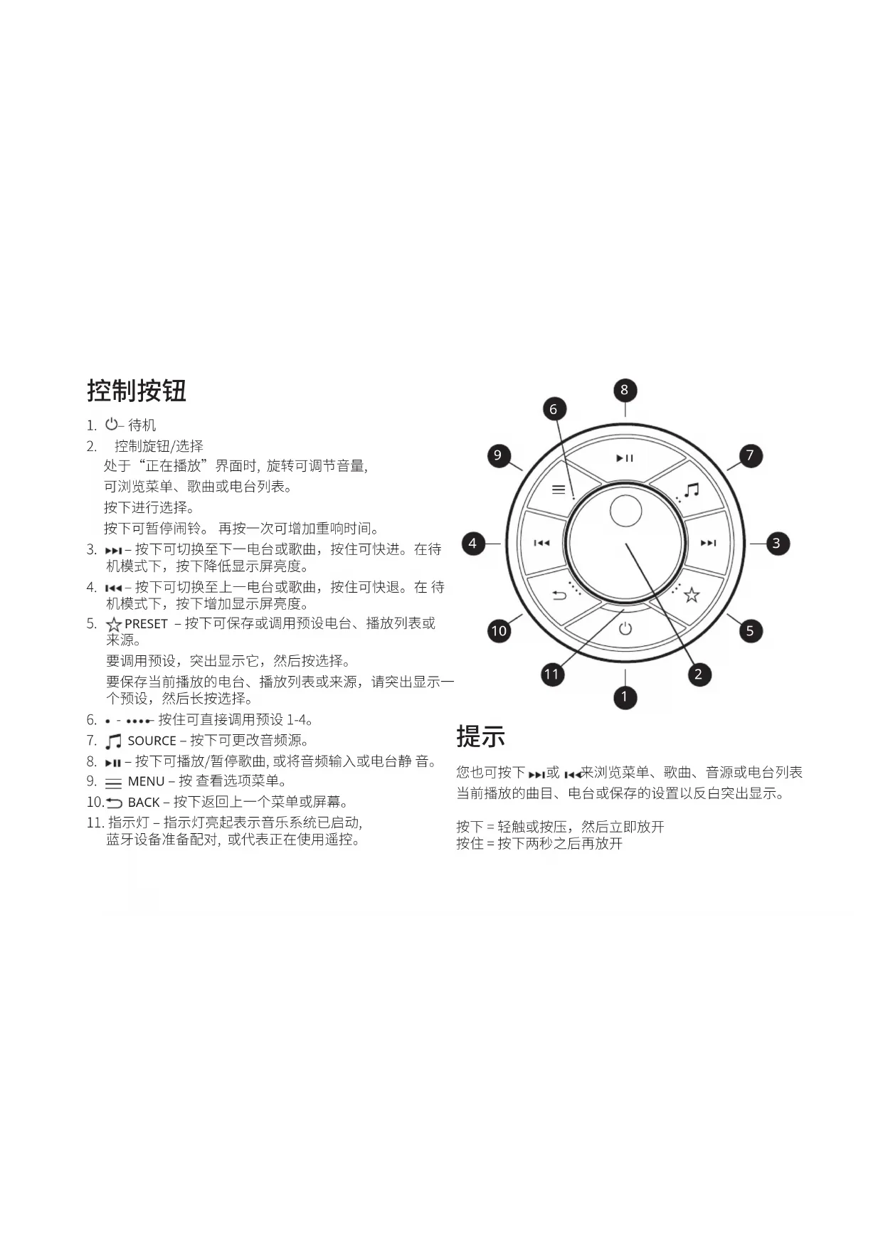 BACK–按下返回上一个菜单或屏幕。 11.指示灯–指示灯亮起表示音乐系统已启动, 蓝牙设备准备配对,或代表正在使用遥控。