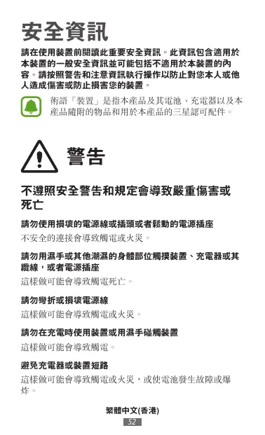 警告 不遵照安全警告和規定會導致嚴重傷害或 死亡 請勿使用損壞的電源線或插頭或者鬆動的電源插座 不安全的連接會導致觸電或火災。 請勿用濕手或其他潮濕的身體部位觸摸裝置、充電器或其 纜線,或者電源插座 這樣做可能會導致觸電死亡。 請勿彎折或損壞電源線 這樣做可能會導致觸電或火災。 請勿在充電時使用裝置或用濕手碰觸裝置 這樣做可能會導致觸電。 避免充電器或裝置短路 這樣做可能會導致觸電或火災,或使電池發生故障或爆 炸。 繁體中文)香港)