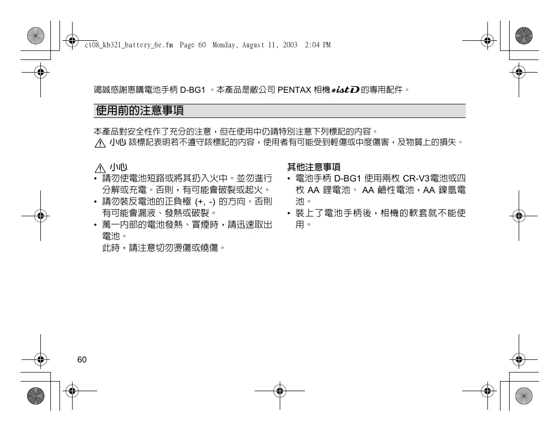 ct08_kb321_battery_6e.fm Page 60 Monday, August 11, 2003 2:04 PM 竭誠感謝惠購電池手柄 D-BG1 。本產品是敝公司 PENTAX 相機w的專用配件。